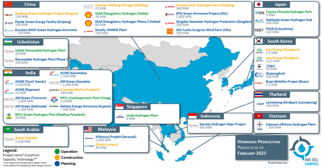 The Fuel Cell Compass presents a current extract of hydrogen production projects across Asia. Most of these projects are located in China and India. This development is analogue to the development of electrolyzer production in Asia (see article).